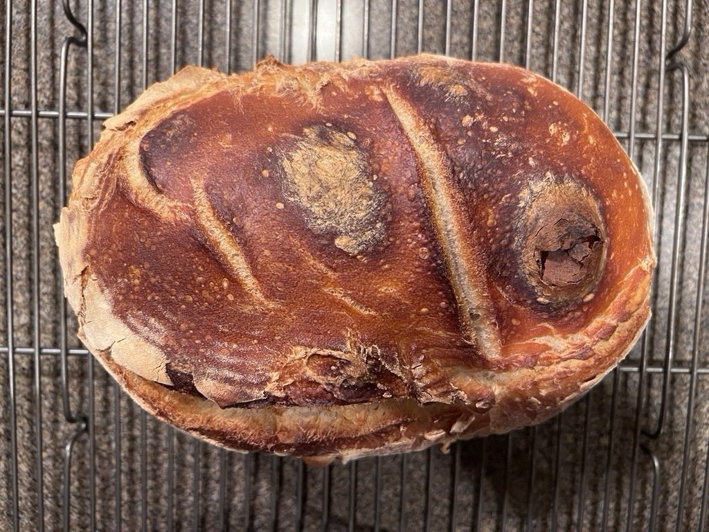 I’ll admit, I probably left my first loaf in the oven a little too long. The crust was a bit darker than I intended, making it look more like a football than a loaf of bread, but it was still chewy, tangy, and absolutely delicious.